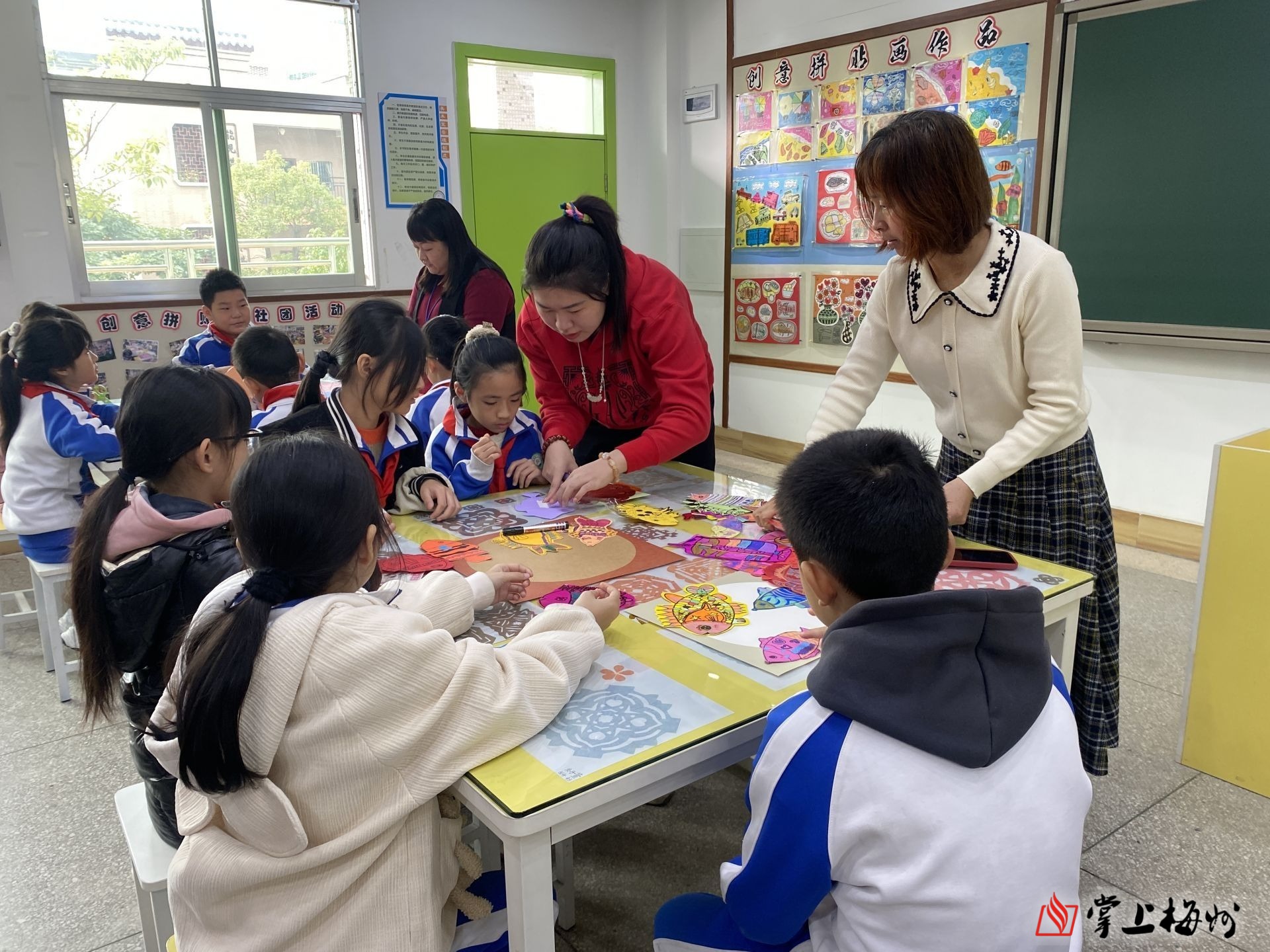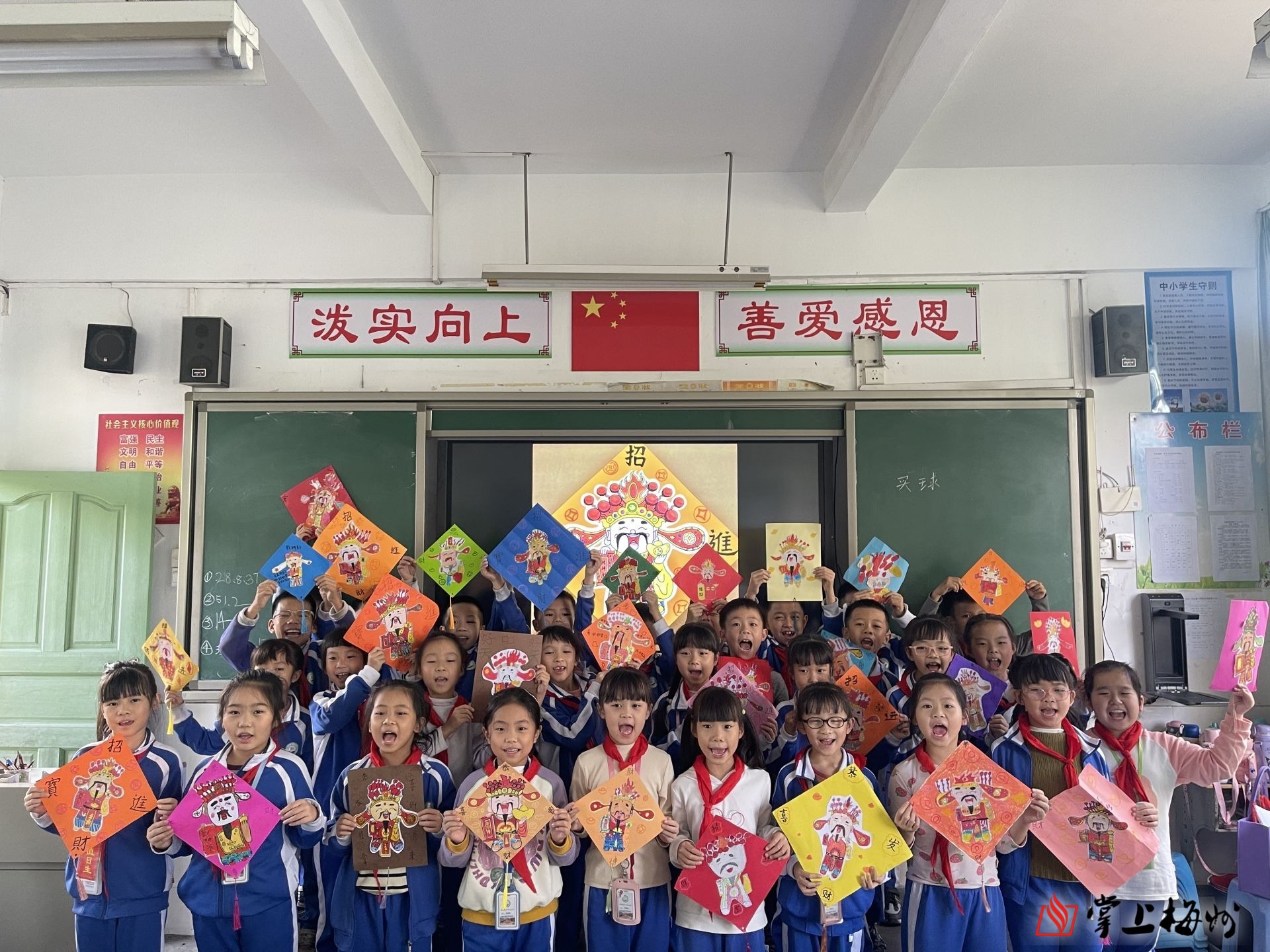 丰顺县汤坑镇第一中心小学美术组老师带领孩子们发挥奇思妙想,通过贴、剪、画等多种方式,将年年有余、辞旧迎新、接福纳祥等美好愿景浓缩到精美画作中。