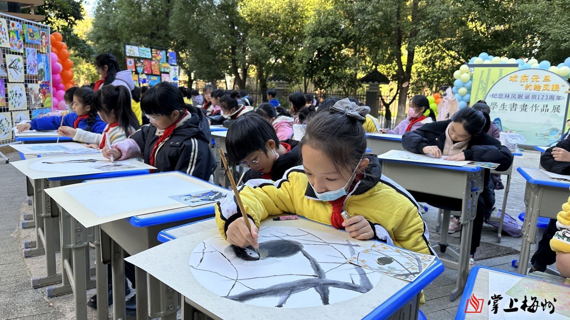在梅江区风眠小学举办的“约绘风眠” 学生书画作品展上,学生们现场作画。
