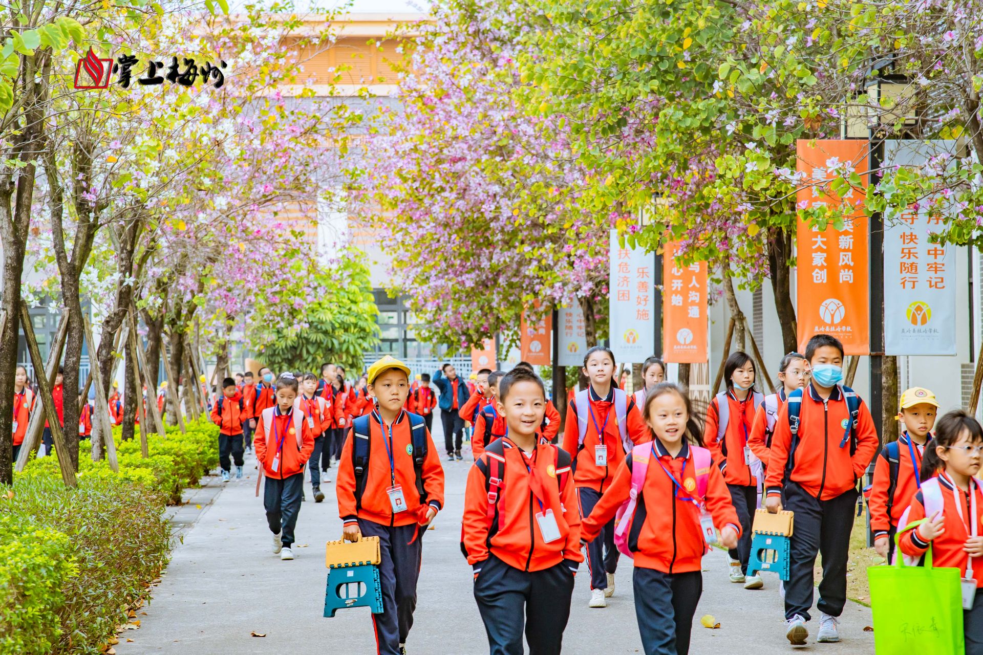 校道两旁的紫荆花如繁星般散在枝头,孩子们迈着轻快的脚步进入校园。 (徐志宝 摄)