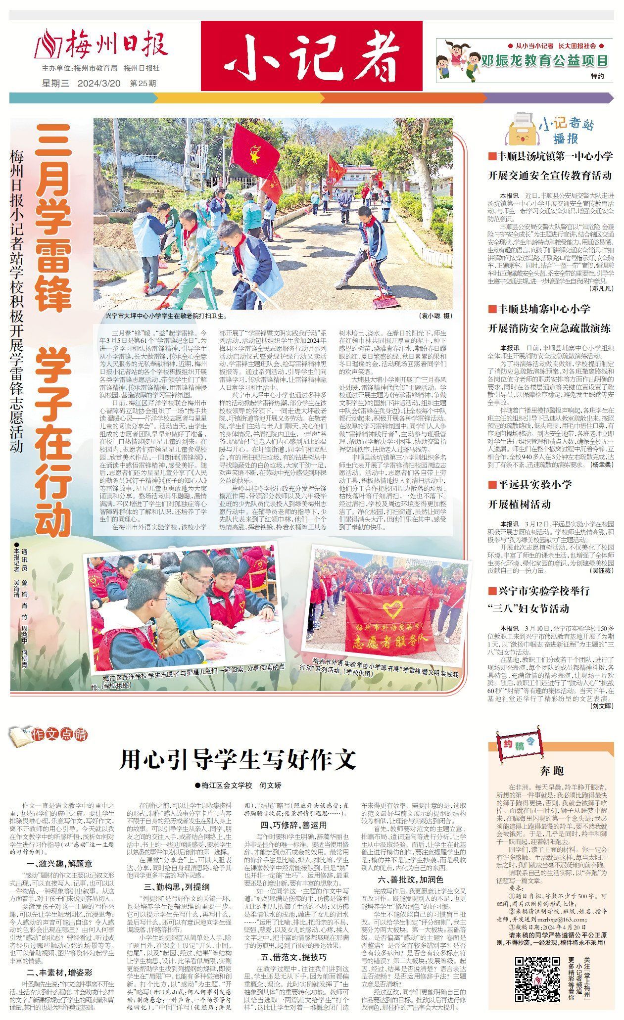 三月春“锋”暖 ,“益”起学雷锋。今年3月5日是第61个“学雷锋纪念日”,为进一步学习和弘扬雷锋精神,引导学生从小学雷锋,长大做雷锋,传承全心全意为人民服务的无私奉献精神,近期,梅州日报小记者站的各个学校积极组织开展各类学雷锋志愿活动,带领学生们了解雷锋精神、传承雷锋精神,用雷锋精神浸润校园,营造浓厚的学习雷锋氛围。
