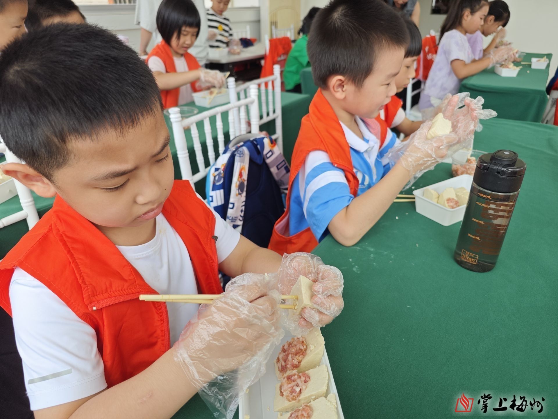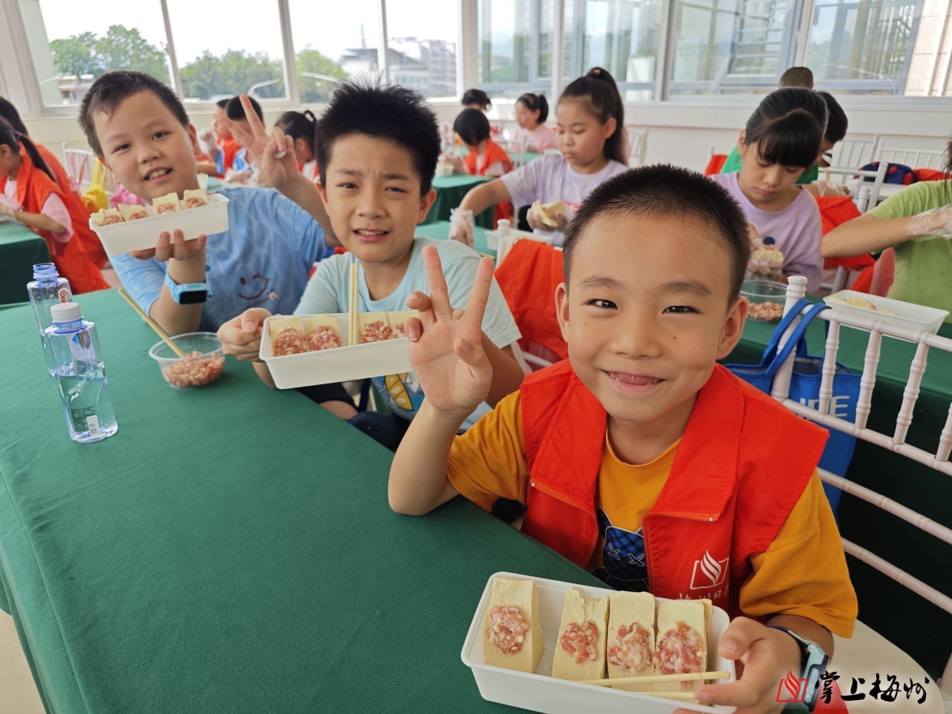 豆腐切成切方块,用小勺在中间挖出一个洞,将调味好的肉糜嵌入其中……到了体验环节,小记者们化身“豆腐小厨神”,不一会儿,一块块酿豆腐就做好啦!豆腐的鲜嫩滑润,肉馅的美味可口,味道浓郁醇厚,让人垂涎欲滴。