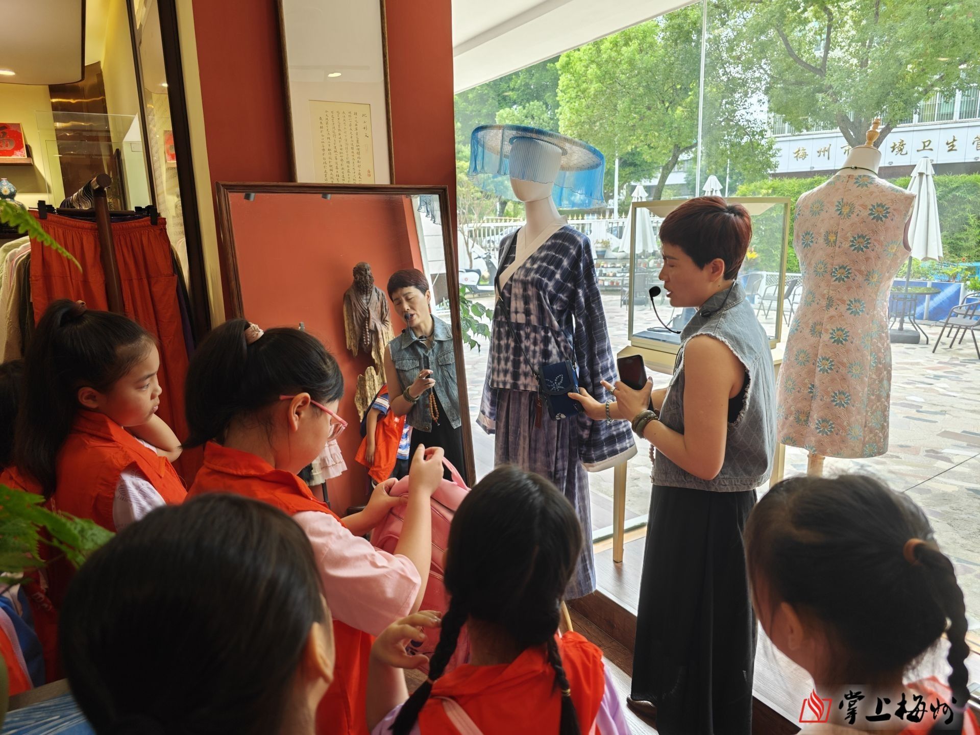 在“诸所有物”非遗研学基地,小记者们还学习了解了植物土法染布技艺,客家人南迁过程中,将植物染的技艺带到了南方地区,经过与当地文化的交融,发展出了植物土法染布技艺。