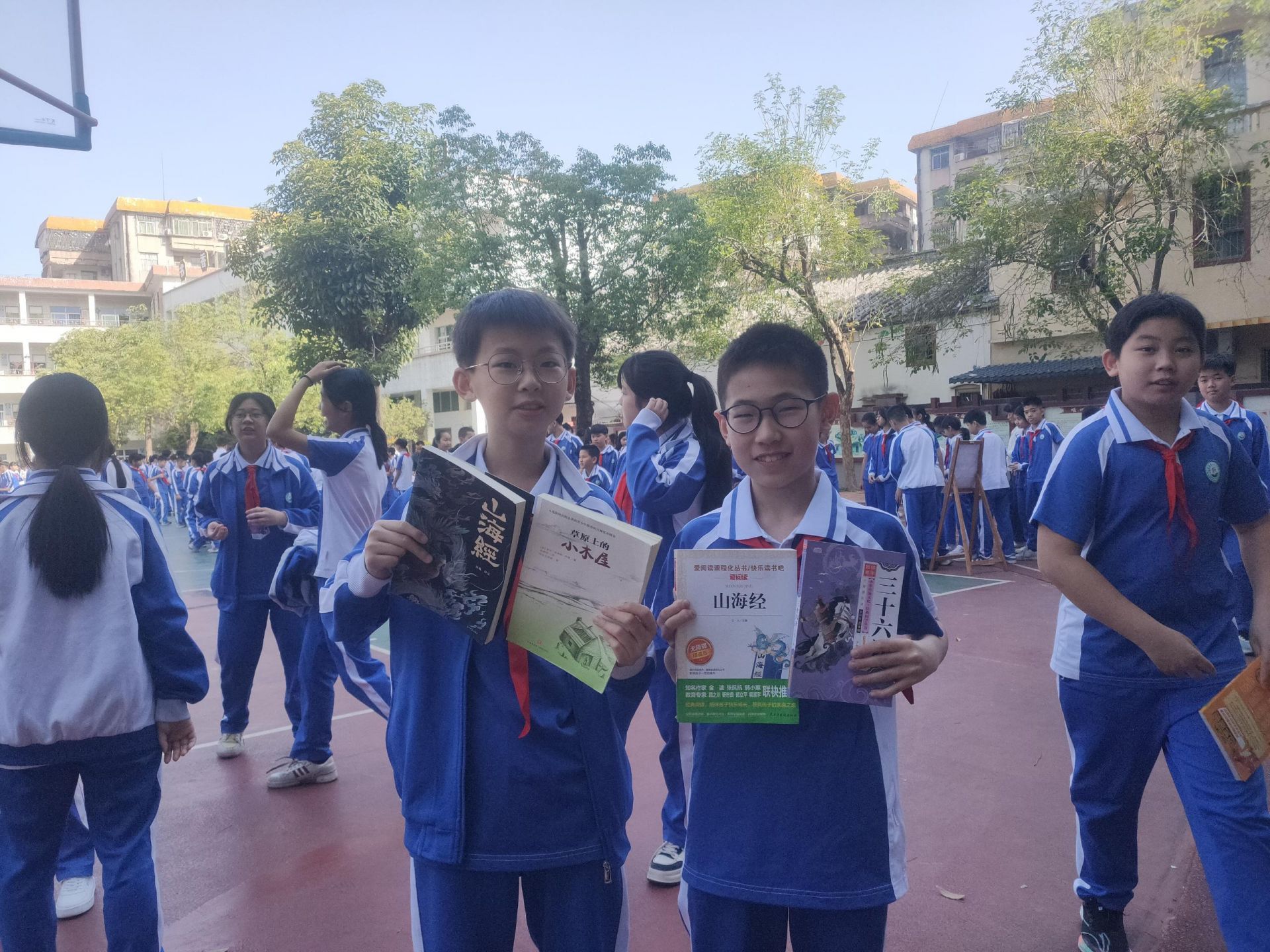 汤坑镇第一中心小学的学生展示自己在“跳蚤书市”上“淘”到的书。 (刘萍供图)