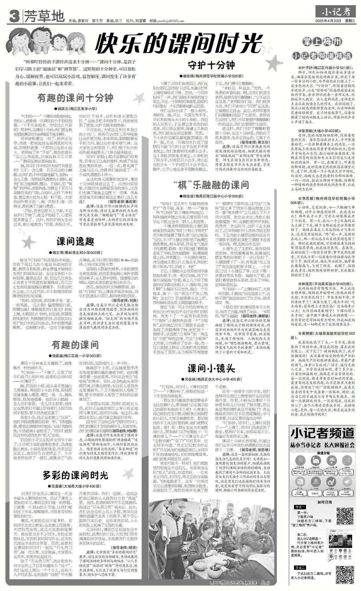 点评:文章围绕“多彩的课间时光”展开,通过具体的活动描写,生动地展现了课间活动的多样性与趣味性。“小人手持武器”“纸张的‘战场’”等创意表达,既充满童趣,又凸显了孩童天马行空的想象力,读来令人忍俊不禁。