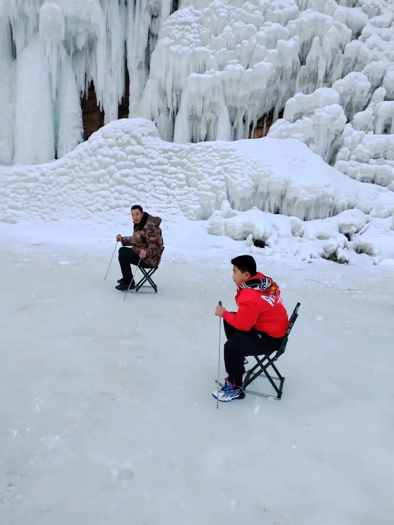 刘梓辰和爸爸在冰天雪地里玩滑冰车(打冰嘎)。