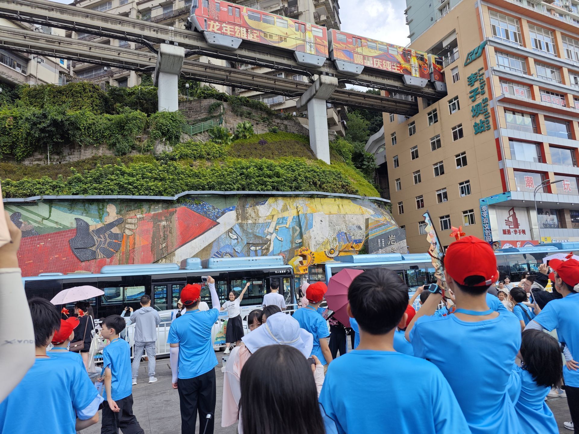 在轻轨李子坝站,往期夏令营小记者探究轻轨穿楼的技术应用和城市规划的影响