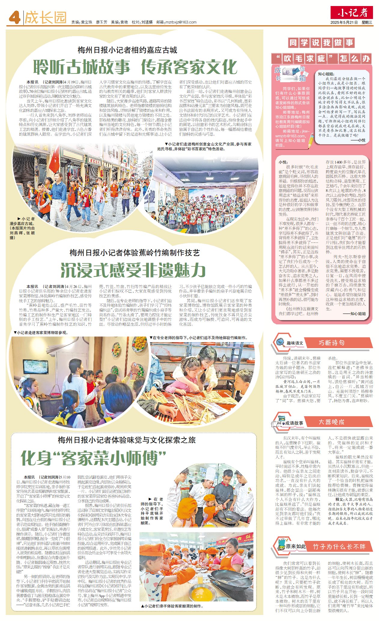 本报讯 (记者刘润涛)4月26日,梅州日报小记者俱乐部的70余位小记者走进客家菜博物馆,体验蕉岭竹编制作技艺,感受传统手工艺的独特魅力。