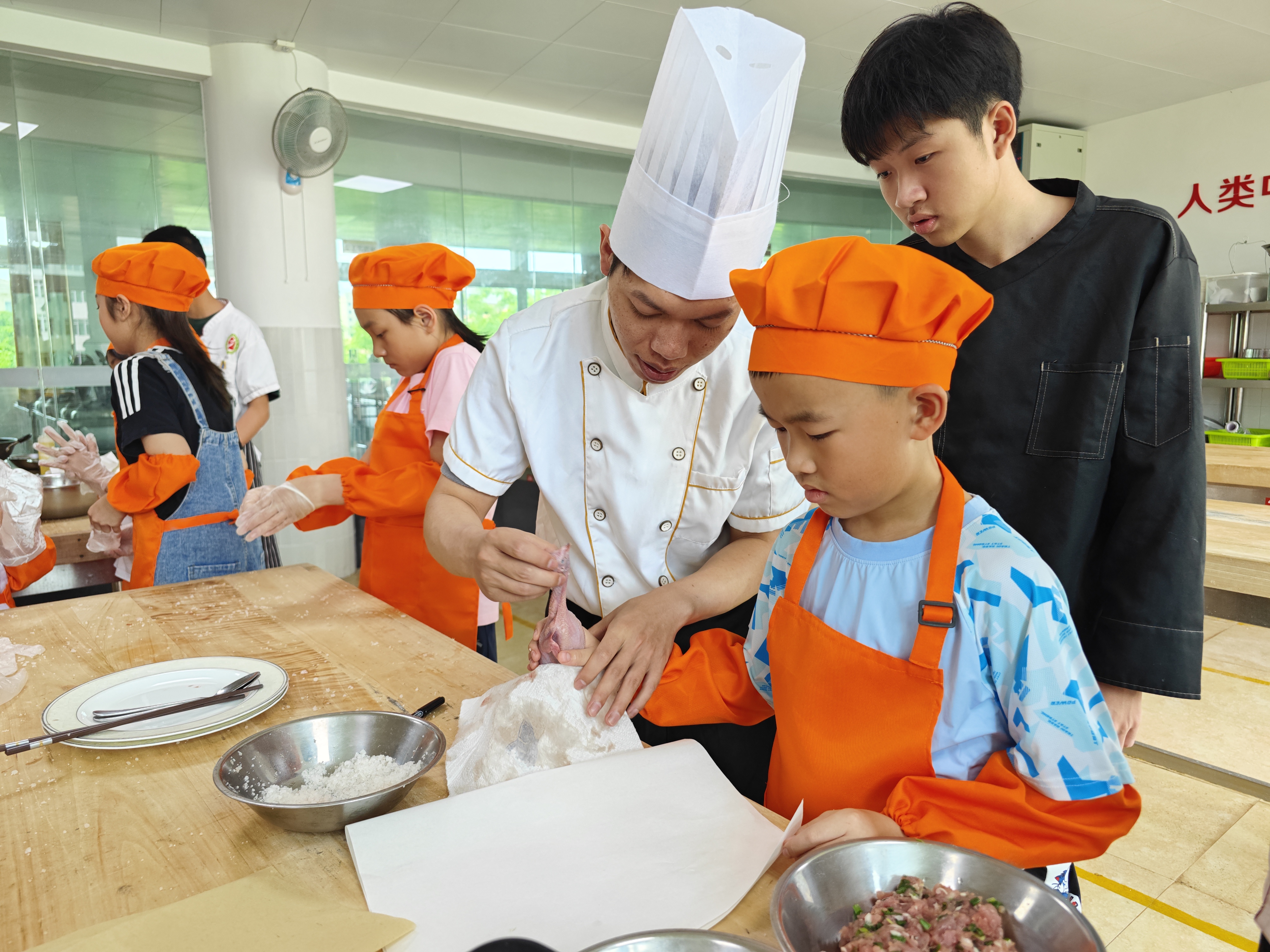 今天,我戴着小记者证,跟着梅州日报的老师,来到梅州市技师学校的食堂学做客家菜。