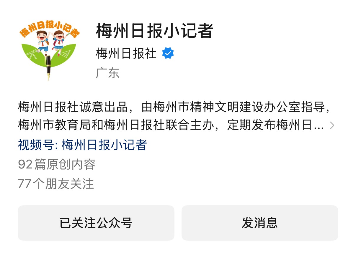 梅州日报社专门为小记者们设立的视频分享平台,用于发布他们自己的新闻报道、采访视频、活动记录等内容。通过视频号,小记者们可以与其他小记者、新闻工作者和观众进行交流和学习,提高自己的新闻采编能力和综合素质。