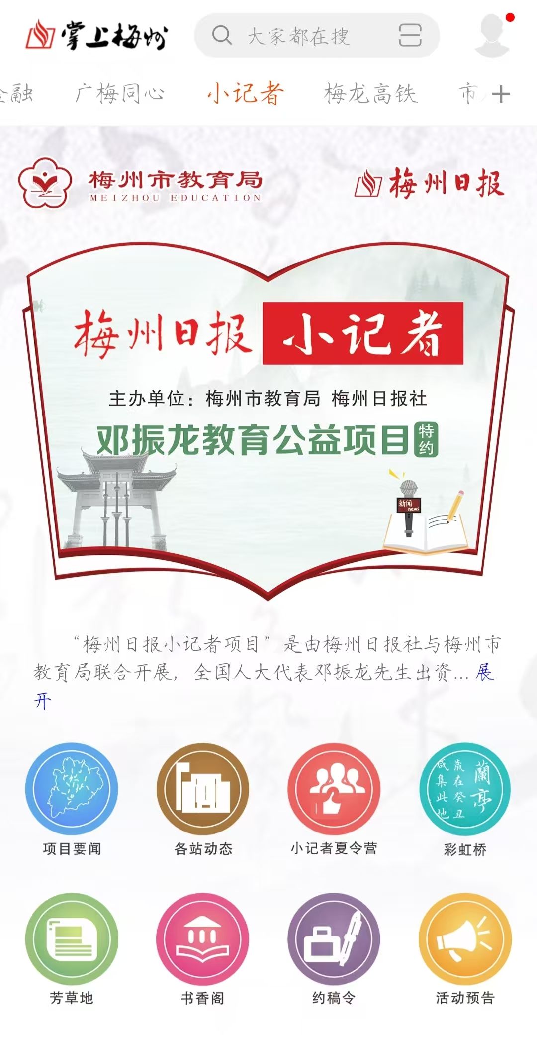 梅州对外宣传的重要窗口,及时向市民传递党委和政府方针政策的重要媒体阵地,其中小记者频道全年不定期更新,作品发表、校园新闻、校内实践、社团活动,每一篇都是小记者们成长的足迹。