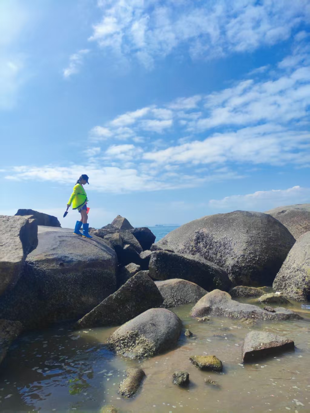 一下车,我们迫不及待地提上小桶和小铁铲,沿着海滩体验原生态的赶海乐趣,我在这里四处搜寻躲在泥沙里的贝壳、螃蟹、海螺,尽享两个小时的赶海时光。