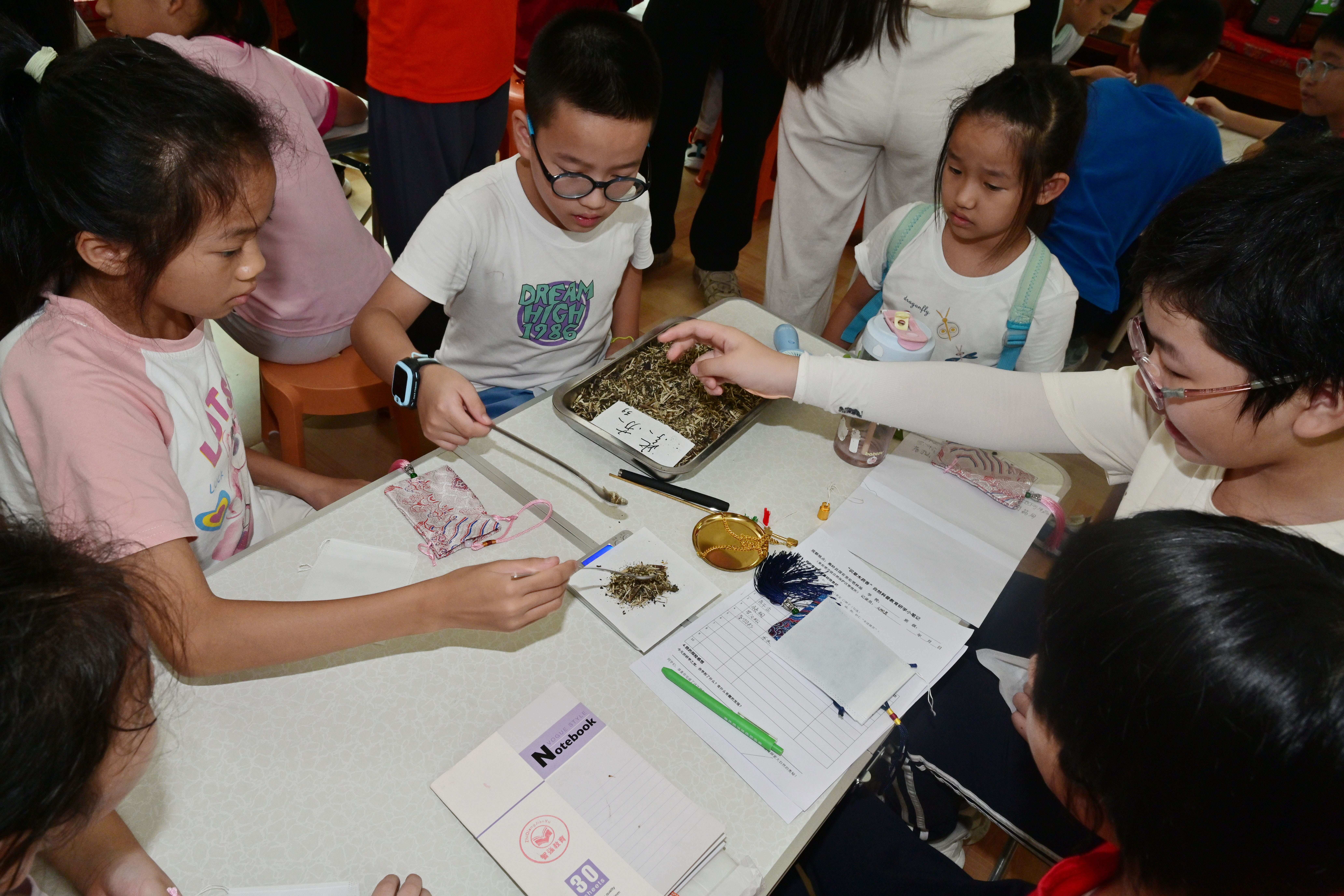 认识完自然教育径的南药,就到了我们最期待的香囊制作环节。科普老师教我们用艾草、薄荷、茉莉花等中草药制作香囊。我的香囊混合了三种草药,味道像打翻的百宝箱,连蚊子都绕着飞。小伙伴安安则做了个“重口味”香囊,闻起来像把整个中药铺塞进了布袋,真是有趣极了!