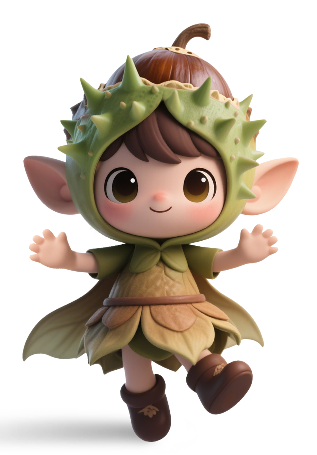 外表:以皇佑笔林场省级种质资源库的吊皮锥为原型,头戴吊皮锥带刺外壳果实的帽子,身着绿褐色渐变的外衣,代表吊皮锥树叶常年常绿以及树皮深褐色的特征,有着精灵一般的耳朵,是皇佑笔的守护小精灵。