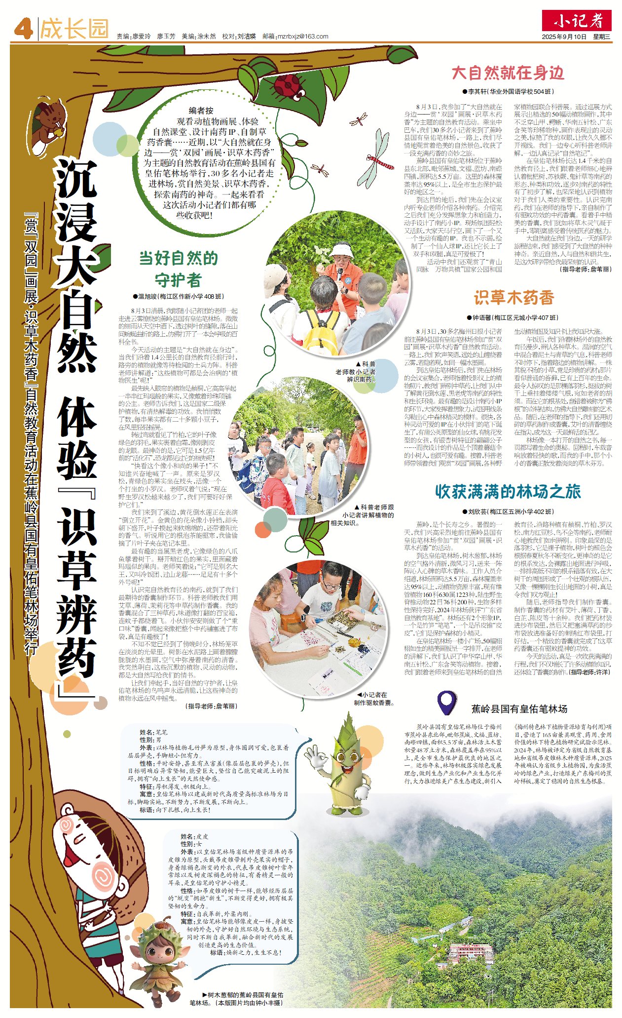 观看动植物画展、体验自然课堂、设计南药IP、自制草药香囊……近期,以“大自然就在身边——赏‘双园’画展·识草木药香”为主题的自然教育活动在蕉岭县国有皇佑笔林场举行,30多名小记者走进林场,赏自然美景、识草木药香,探索南药的神奇。一起来看看这次活动小记者们都有哪些收获吧!
