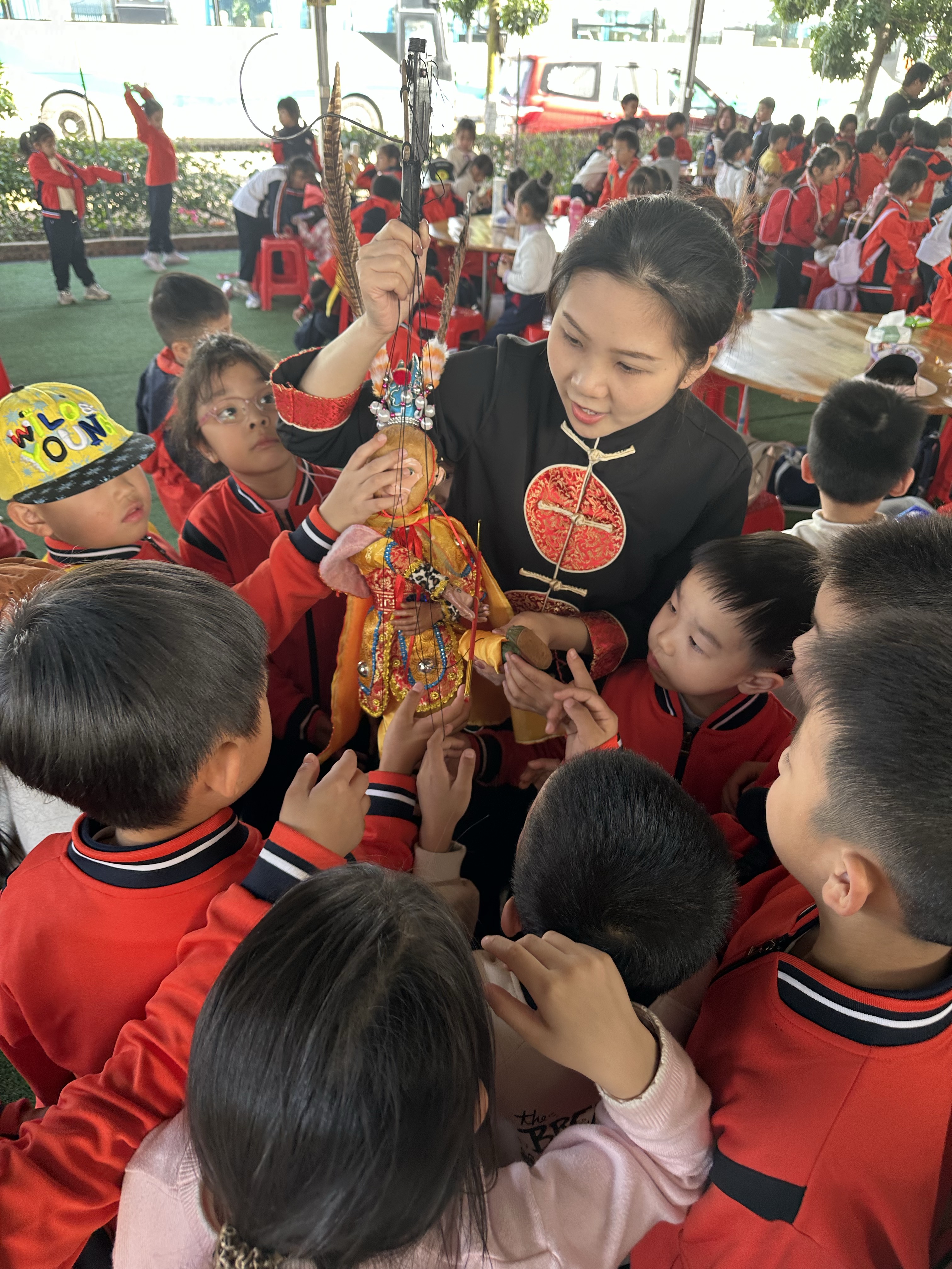 梅江区客都小学的学生们在体验提线木偶的操作。