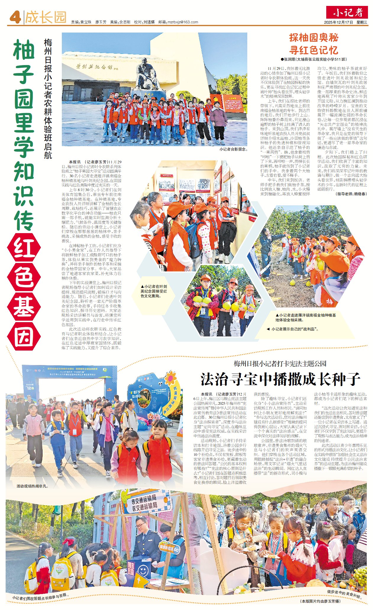 11月29日,梅州日报小记者时令农耕系列体验班之“柚子果园大寻宝”活动圆满举行。30名小记者走进雁洋镇南福金柚种植基地与叶剑英纪念园,在田园实践与红色熏陶中度过充实的一天。