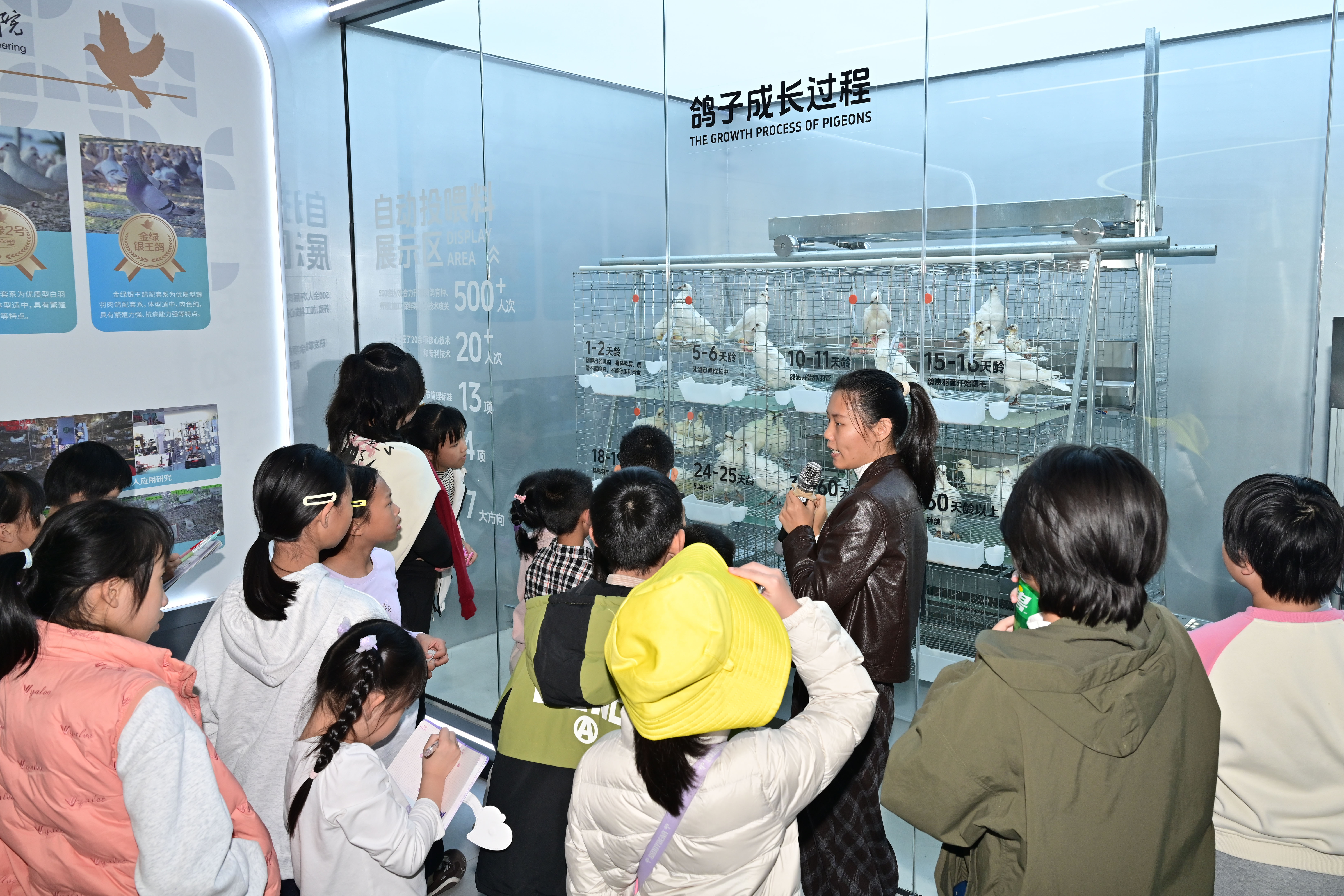 在兴宁市肉鸽省级现代农业产业园展厅,小记者聆听工作人员介绍“陈小鸽”品牌的创业故事。(钟小丰 摄)