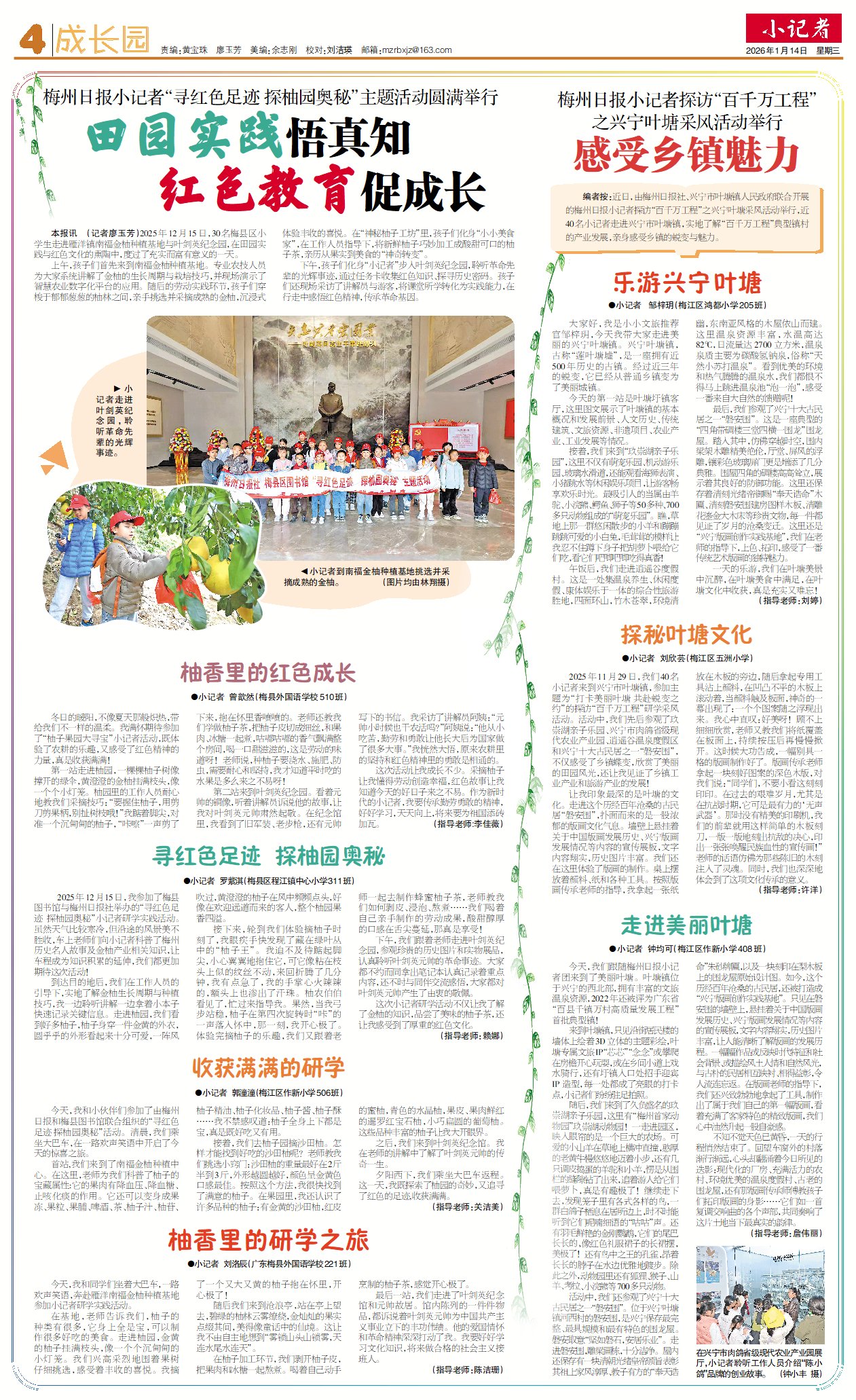 本报讯 (记者廖玉芳)2025年12月15日,30名梅县区小学生走进雁洋镇南福金柚种植基地与叶剑英纪念园,在田园实践与红色文化的熏陶中,度过了充实而富有意义的一天。