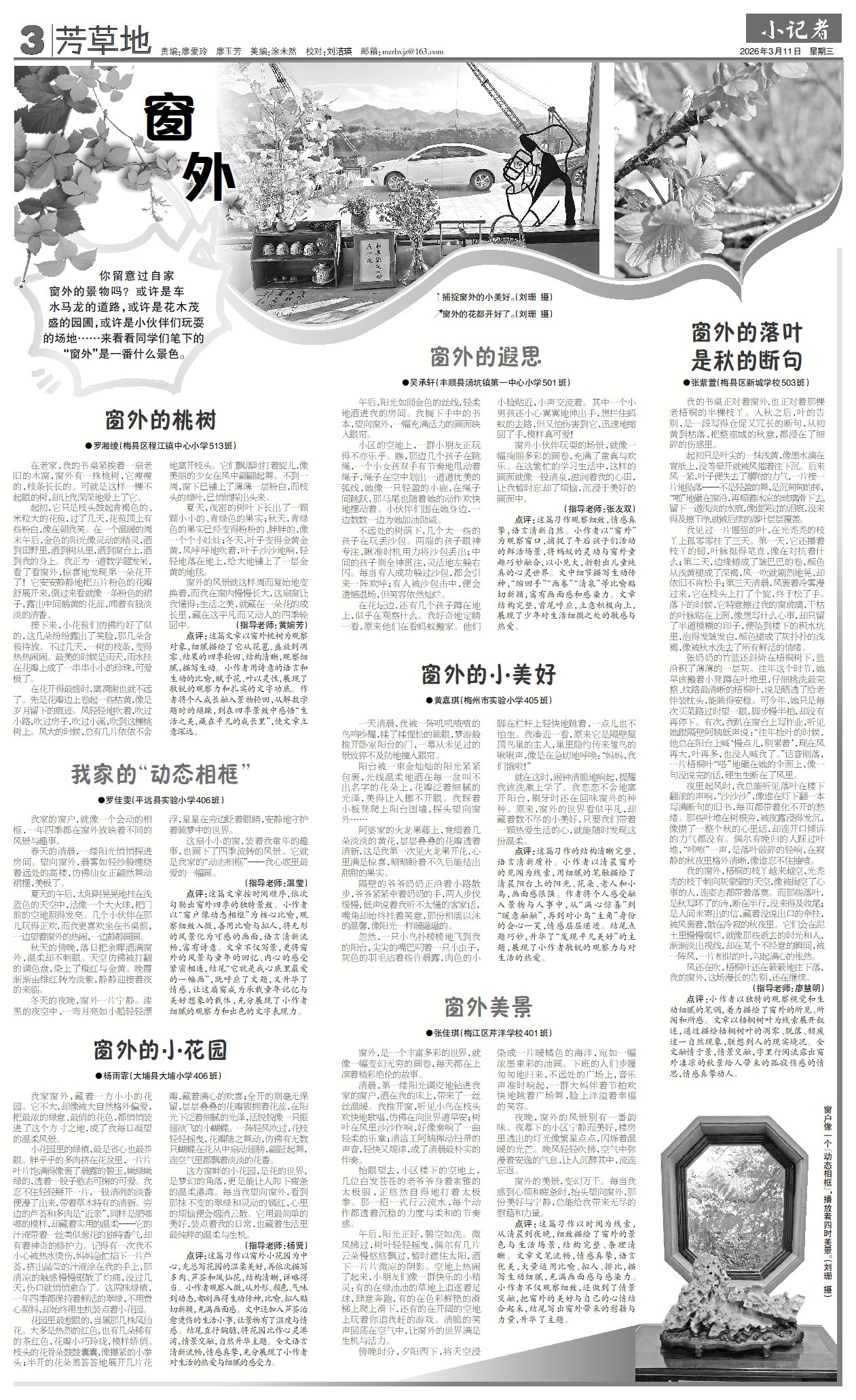 你留意过自家窗外的景物吗?或许是车水马龙的道路,或许是花木茂盛的园圃,或许是小伙伴们玩耍的场地……来看看同学们笔下的“窗外”是一番什么景色。