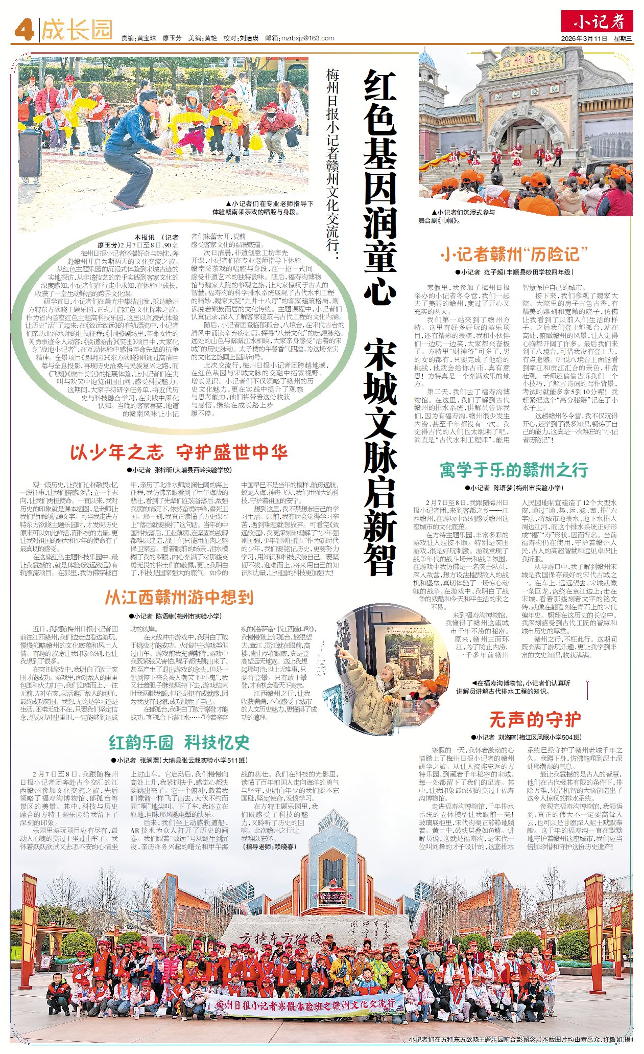 本报讯 (记者廖玉芳)2月7日至8日,90名梅州日报小记者怀揣好奇与热忱,奔赴赣州开启为期两天的文化交流之旅。从红色主题乐园的沉浸式体验到宋城古迹的实地探访,从非遗技艺的亲手实践到客家文化的深度感知,小记者们在行走中求知,在体验中成长,收获了一堂生动鲜活的跨界文化课。