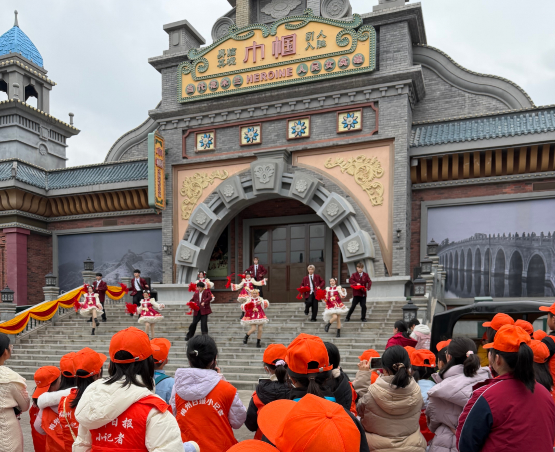 小记者们在方特东方欲晓主题乐园前合影留念。(本版图片均由黄禹众、许敏如 摄)