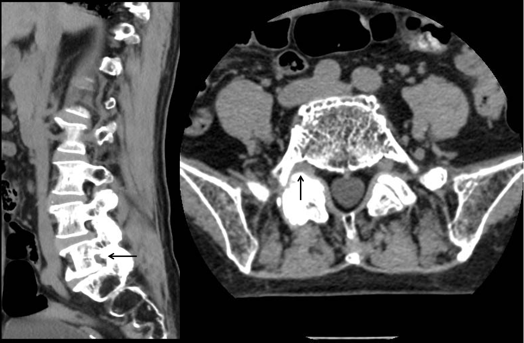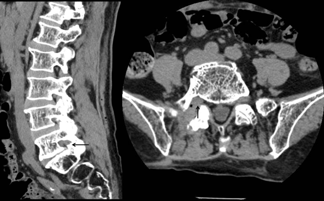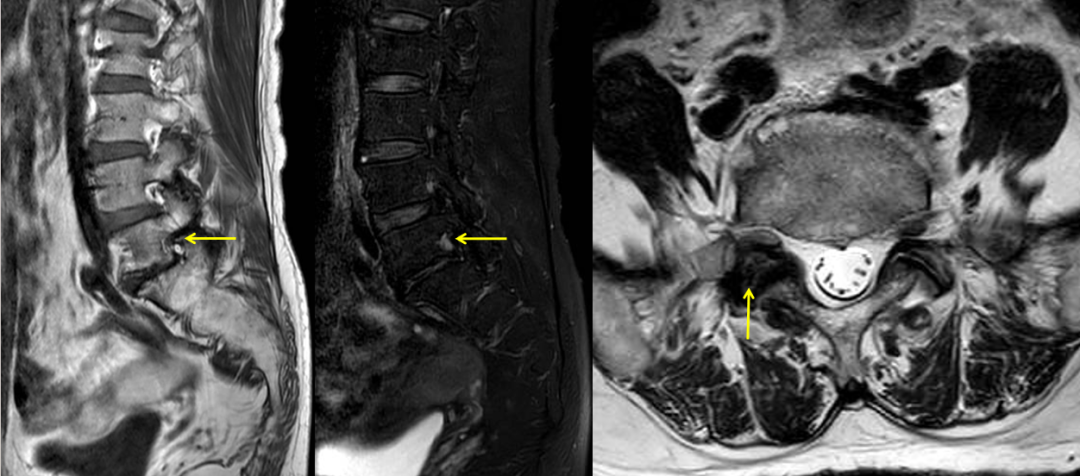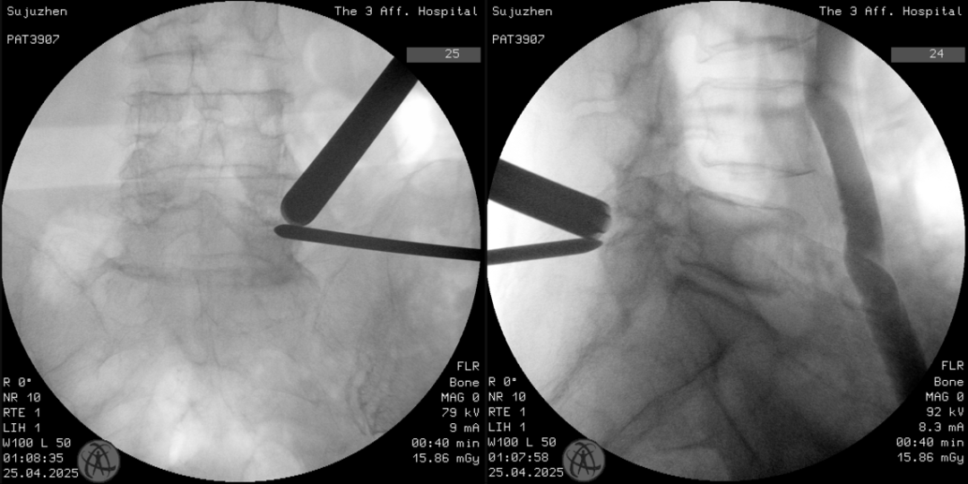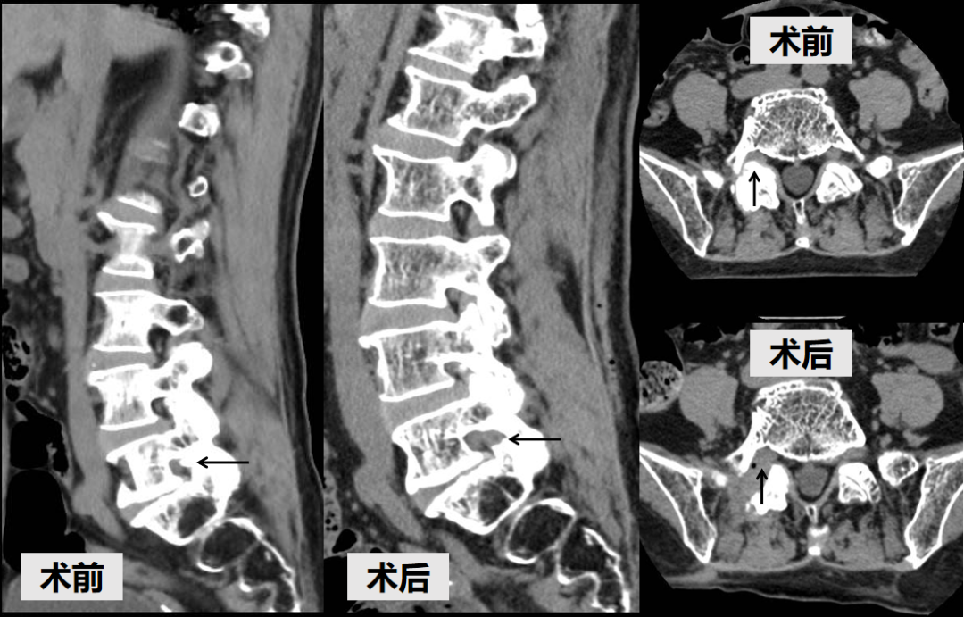 为了进一步明确诊断,团队为患者实施了选择性右侧L5神经根造影及封闭检查,在透视下将药物精准注射至疑似病变神经根周围,以达到暂时麻痹病变神经根的目的。注射药物前患者在手术室坐2分钟即出现右下肢疼痛难忍的情况,而注射后立即让患者再次尝试坐位7分钟后仍未出现右下肢不适。说明右侧L5神经根就是病变神经根,证实了诊疗团队的病因推测,明确了诊断。