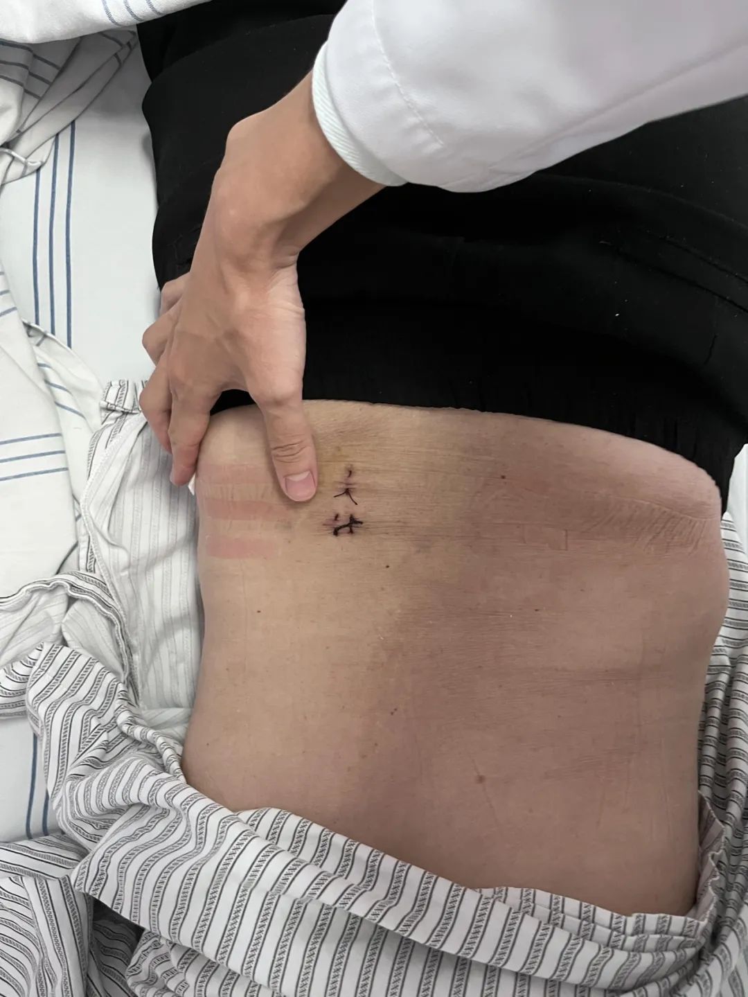 针对这一复杂病情,结合患者身体状况,团队决定采用目前先进的微创技术——单侧双通道内镜技术(UBE)切除增生骨质,解除神经压迫。相较于传统开放手术,UBE仅需两个1厘米左右的切口,通过椎旁入路精准到达病灶,切除增生的右侧S1上关节突尖部,扩大椎间孔,既能彻底解除神经压迫,又最大限度保护脊柱稳定性。手术顺利完成,术后次日苏女士即感右下肢轻松,坐起吃饭30分钟也没有出现疼痛,“像卸下了千斤重担”。