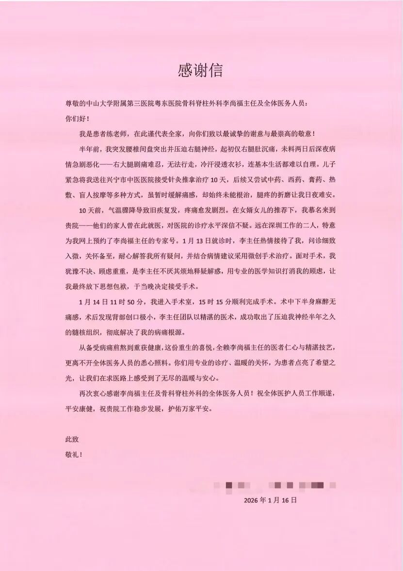 “从备受病痛煎熬到重获健康,这份重生的喜悦,靠的是李尚福主任的医者仁心与精湛技艺,更离不开全体医护人员的悉心照料。你们用专业的诊疗、温暖的关怀,为患者点亮了希望之光,让我们在求医路上感受到了无尽的温暖与安心。”练老师激动地说。他在1月16日亲自写下感谢信及送上锦旗,字里行间满是感激。