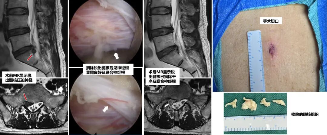 次日(1月14日)上午11:50,手术准时开始。在硬膜外麻醉+镇静下,李尚福主任团队通过一个仅1厘米的微小切口,精准定位病变节段,利用高清椎间孔镜系统,经椎板间入路完整摘除脱出的髓核组织,彻底解除神经压迫,并在手术过程中发现了患者骶1神经根的多根变异。全程患者无痛,术后背部仅留一枚创可贴即可覆盖的伤口。