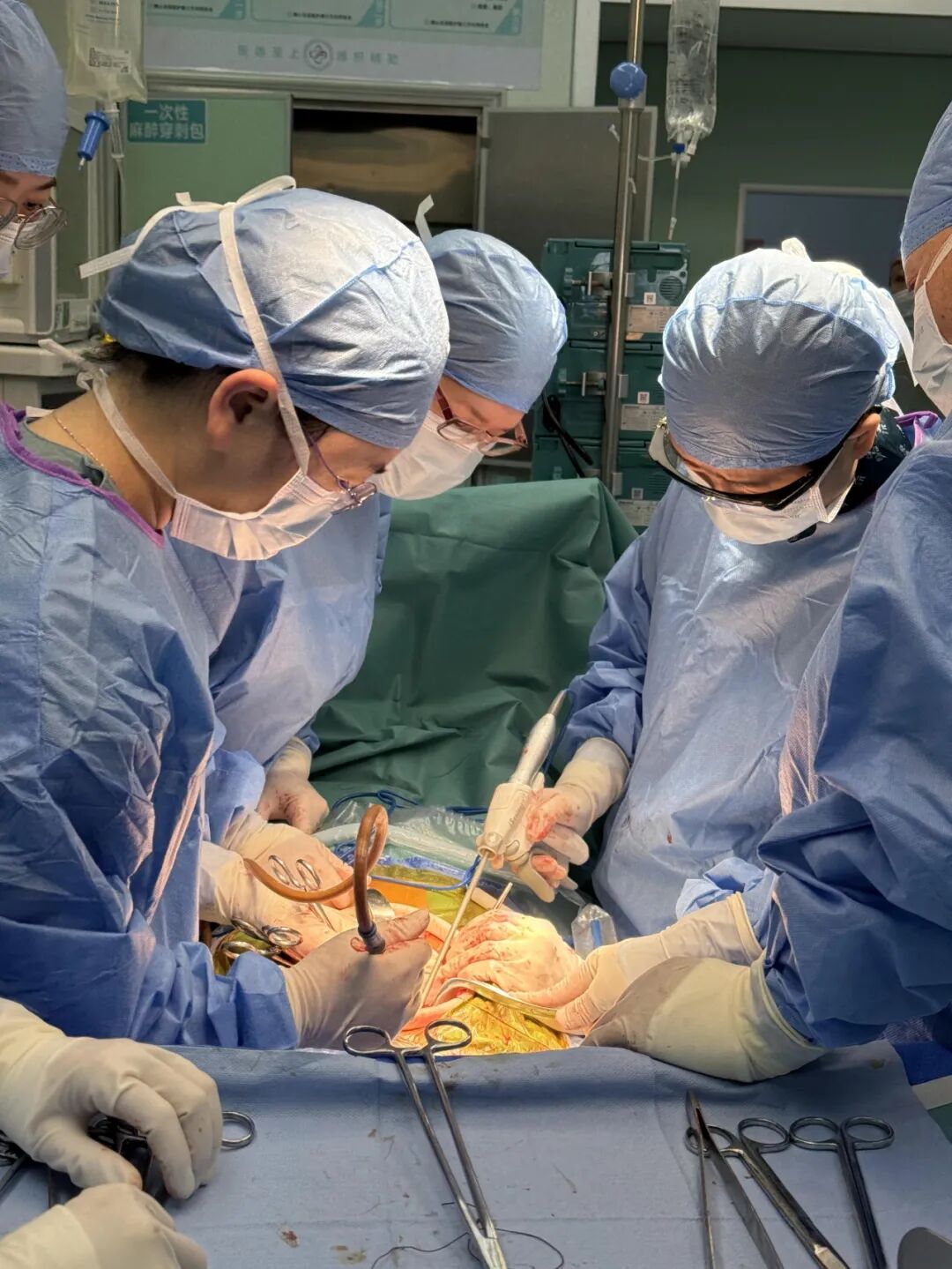 于是,手术台上多学科专家并肩作战,展开了一场精准的“接力赛”:妇科团队在张宇教授带领下首先打开腹腔,术中探查发现,来源于左侧卵巢的肿瘤与周围组织广泛粘连,肿瘤侵犯乙状结肠,手术团队细致理清肿瘤与周围脏器的复杂粘连。胃肠外科团队随即接力,在宋小康、曾绍兵两位医师的操作下,对患者受侵犯的乙状结肠进行精细游离、切除并实施造口,解除肠梗阻。肝胆外科团队紧接着在周志涛主任医师的率领下,精准定位并完整切除了位于肝脏的肿瘤转移病灶。最后,妇科团队再次登场,系统性切除了全子宫、双附件、大网膜及所有可见盆腹膜转移病灶的彻底清扫。