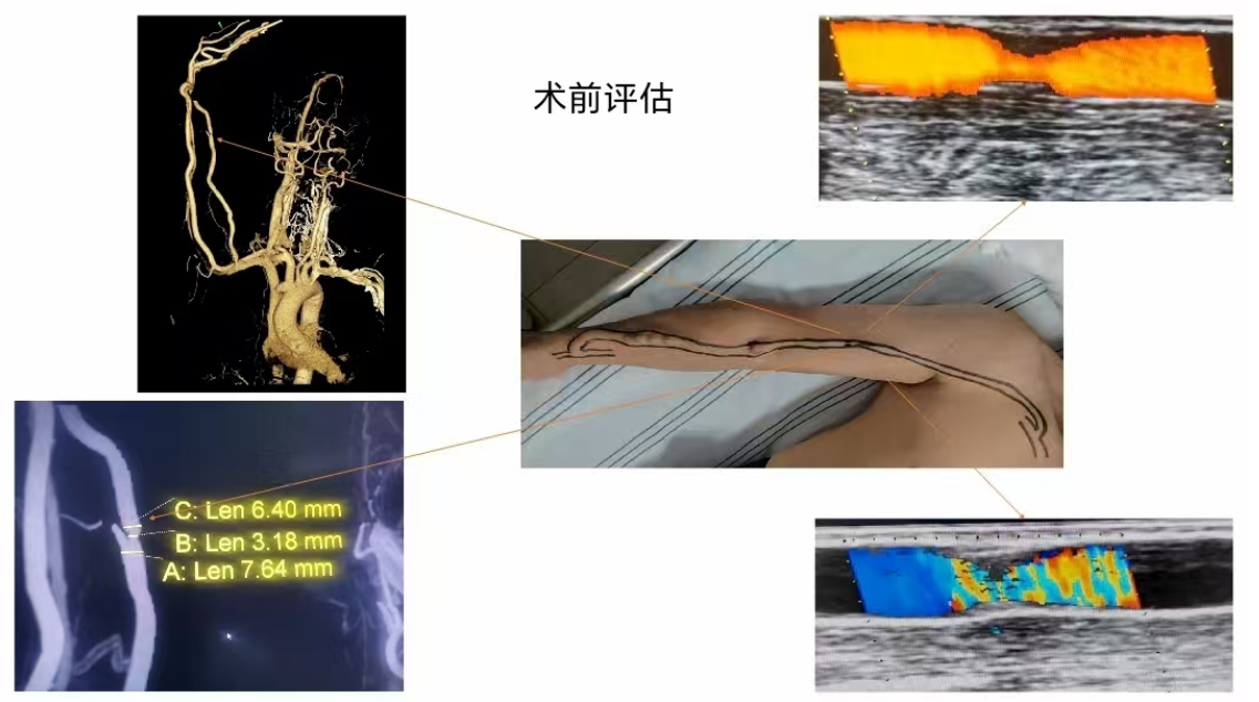入院后,经中山大学附属第三医院粤东医院肾内科血管通路团队全面评估,确诊其上臂回流静脉存在严重狭窄,造成内瘘压力过高,导致止血困难。考虑到该患者在短期内多次出现再狭窄,传统PTA手术难以维持长期通畅,团队果断提出行“超声引导下上肢动静脉内瘘覆膜支架置入术”的治疗方案。