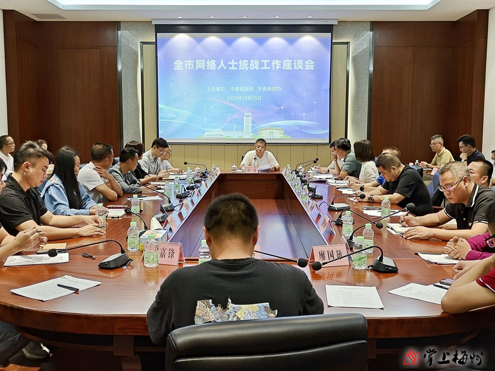 掌上梅州讯 10月25日下午,市委统战部、市委网信办在梅城联合召开全市网络人士统战工作座谈会,传达学习习近平总书记关于网络强国的重要思想,以及全国网络安全和信息化工作会议精神,交流探讨新时期网络人士统战工作发展路径和重点举措,市委常委、统战部部长崔毅出席会议并讲话。市委宣传部、市委统战部有关负责同志,以及市、各县(市、区)网络代表人士共30多人参加会议。