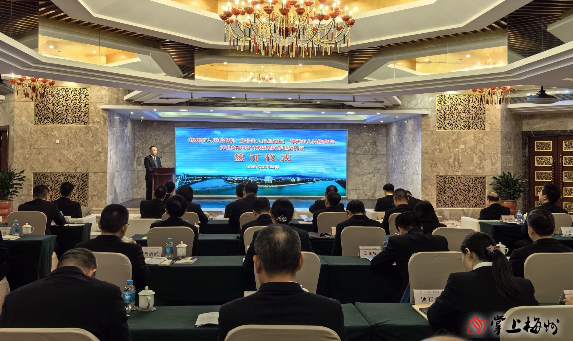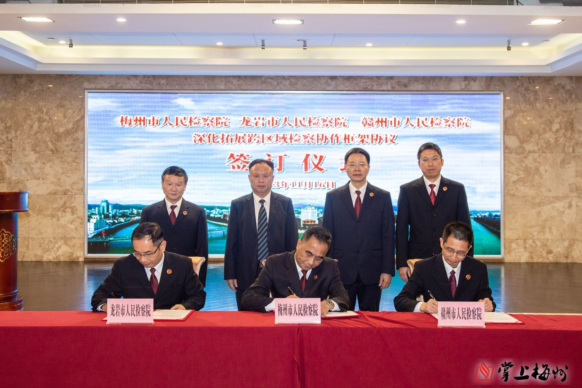 掌上梅州讯 11月16日,广东梅州、福建龙岩、江西赣州三市检察机关举行深化拓展跨区域检察协作框架协议签订仪式,会签《关于深化拓展梅州龙岩赣州跨区域检察协作的框架协议》,凝聚法治合力服务保障苏区高质量发展。梅州市委常委、政法委书记梁维出席签订仪式并致辞。梅州市检察院党组书记、检察长吴文志,龙岩市检察院党组书记、检察长卓先发,赣州市检察院党组书记、检察长熊良明出席活动。