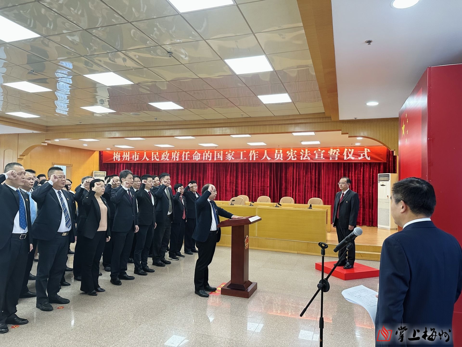 掌上梅州讯 3月21日下午,梅州市人民政府举行宪法宣誓仪式。在副市长谢钦文的监督下,45位市政府任命的国家工作人员向宪法宣誓。