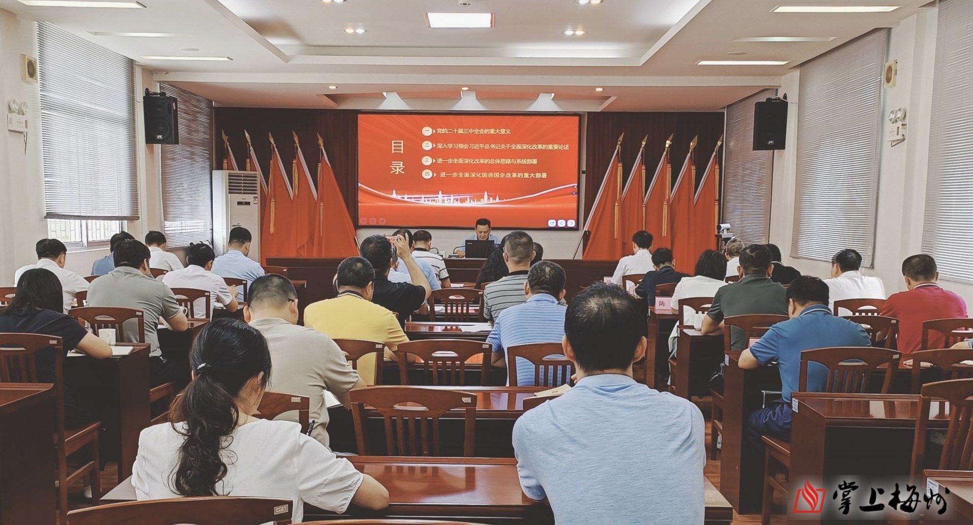 丘孝东以学习贯彻习近平总书记在党的二十届三中全会上的重要讲话精神为主线,以《中共中央关于进一步全面深化改革、推进中国式现代化的决定》为内容,以《进一步全面深化市属国资国企改革 全力服务中国式现代化的梅州实践》为课题,从“党的二十届三中全会的重大意义”“深入学习领会习近平总书记关于全面深化改革的重要论述”“进一步全面深化改革的总体思路与系统部署”“进一步全面深化国资国企改革的重大部署”等方面,对党的二十届三中全会精神进行了全面解读,系统阐述了进一步全面深化改革的指导思想、总目标、重大原则、重大举措和重要要求,并结合国资国企改革事例和工作思考,深入阐释全会对深化国资国企改革作出的集中部署和具体安排,提出具体贯彻落实意见,要求市属国资国企系统党员干部职工切实把思想和行动统一到习近平总书记重要讲话精神上来,统一到全会精神上来,统一到党中央重大部署上来,准确把握国资国企改革在进一步全面深化改革战略全局中的使命任务,坚定不移坚持和加强党对国资国企改革的全面领导,用好改革开放“关键一招”,坚定不移做强做优做大国有资本和国有企业,为中国式现代化法人梅州实践注入市属国资国企力量。