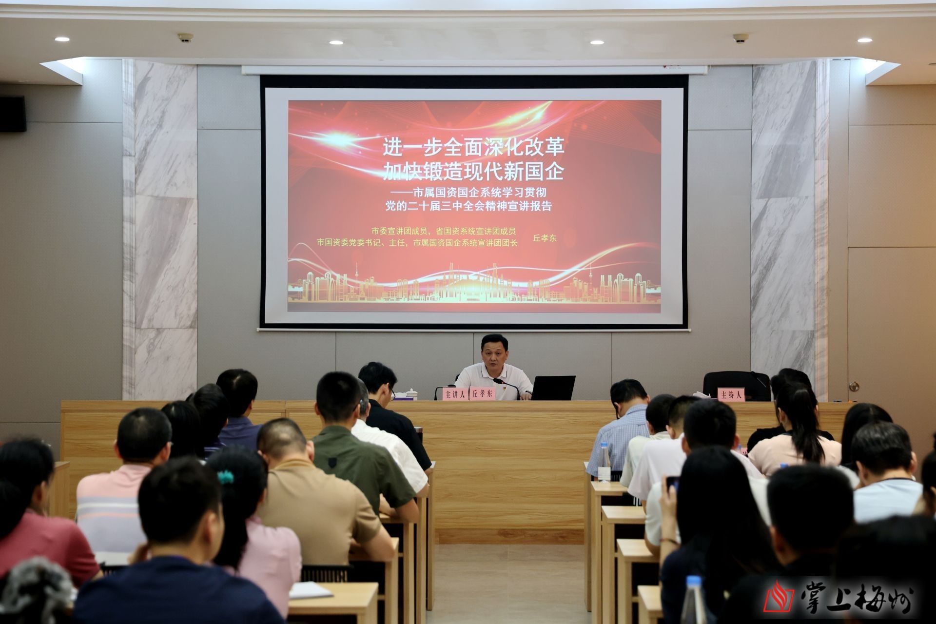 在宣讲报告会上,丘孝东从深刻领会全会的重大意义、深刻领悟习近平总书记关于全面深化改革的重要论述、准确把握进一步全面深化国资国企改革的战略部署、全力以赴推动全会精神落实落地等四个方面进行全面宣讲。他表示,全会把深化国资国企改革纳入全面深化改革战略全局,对深化国资国企改革进行了系统部署,涵盖了国有经济、国有资本、国有企业、国有资产等不同层面,与习近平总书记关于国有企业改革发展和党的建设重要论述一脉相承、一以贯之,鲜明标定了国资国企在新征程上深化改革的方位、前行的节奏和工作的重点,为进一步深化国资国企改革指明了根本方向、提出了基本原则、作出了战略部署、明确了工作重点,对现代化新征程上国资国企改革发展具有重大意义。