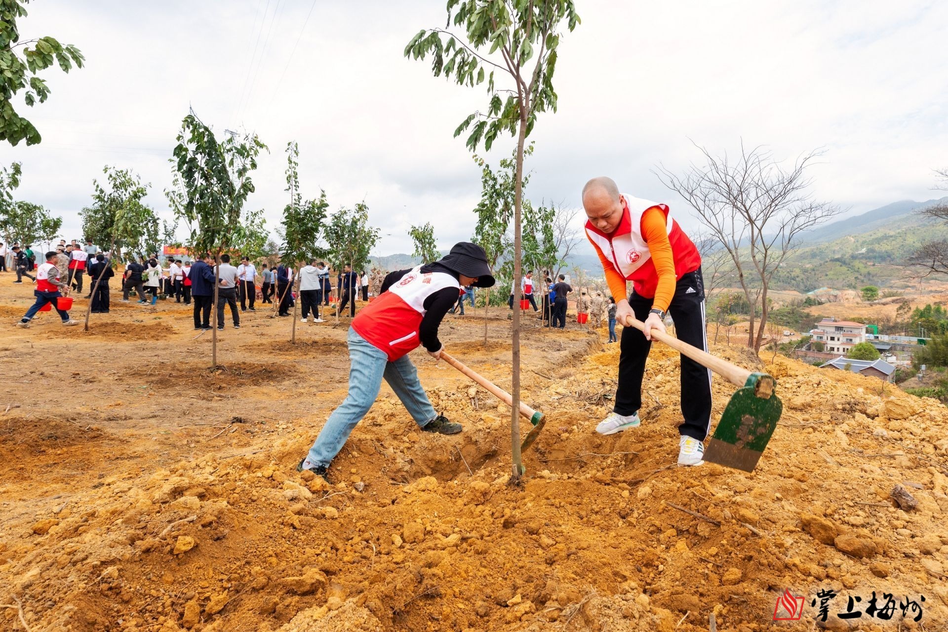 挥锹铲土、培土夯实、提水浇灌……活动现场,大家纷纷拿起铁锹、拎着水桶、扶稳树苗,分工合作、默契配合,义务植树的热情高涨,现场共栽下樱花、仪花、桃花等树种3000多株,为美丽梅州再添一抹新绿。