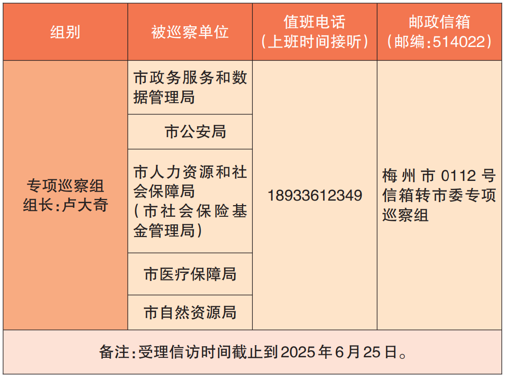 本次专项巡察时间为4月下旬至6月下旬。其间,市委专项巡察组设立专门联系电话和信箱,主要受理反映涉及政务服务工作方面问题的来信来电来访。受理信访时间截止到2025年6月25日。