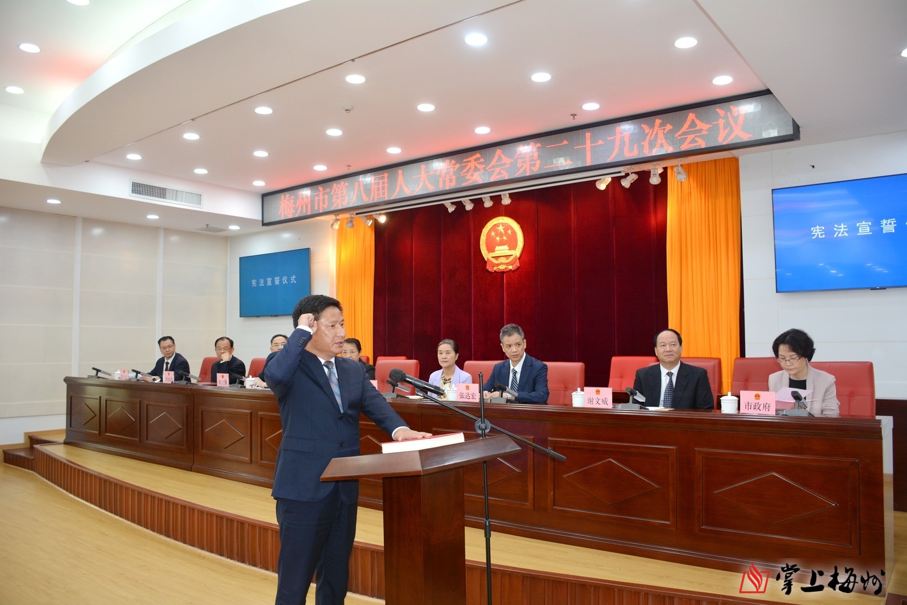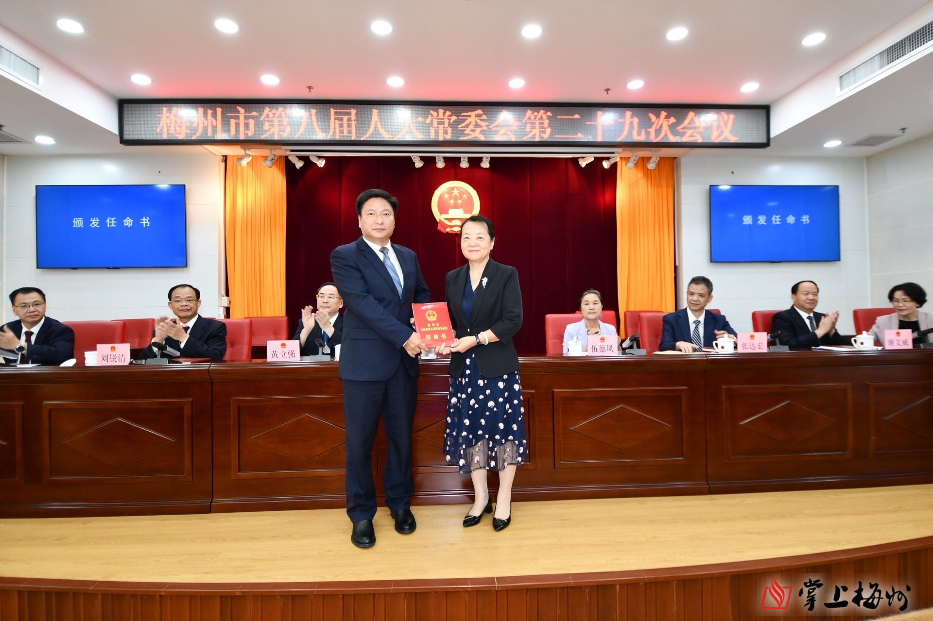会议听取和审议了有关人事任免事项。经会议表决通过,决定任命胡学冬为梅州市人民政府副市长,现场颁发任命书。会议还举行宪法宣誓仪式,在市人大常委会组成人员的监誓下,胡学冬向宪法庄严宣誓,并作就职发言。