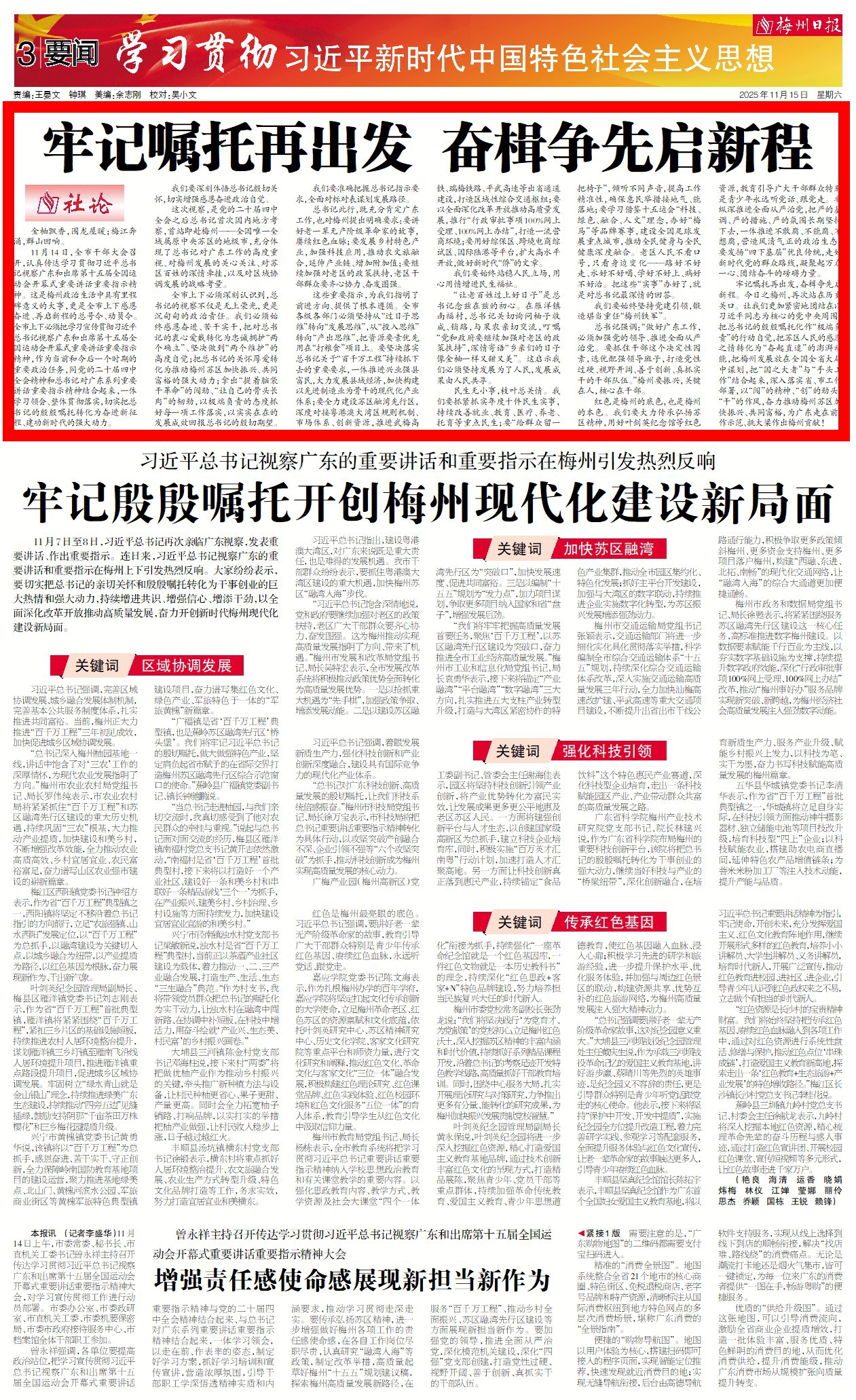 11月14日,全市干部大会召开,认真传达学习贯彻习近平总书记视察广东和出席第十五届全国运动会开幕式重要讲话重要指示精神。这是梅州政治生活中具有里程碑意义的大事,更是全市上下感恩奋进、再启新程的总号令、动员令。全市上下必须把学习宣传贯彻习近平总书记视察广东和出席第十五届全国运动会开幕式重要讲话重要指示精神,作为当前和今后一个时期的重要政治任务,同党的二十届四中全会精神和总书记对广东系列重要讲话重要指示精神结合起来,一体学习领会、整体贯彻落实,切实把总书记的殷殷嘱托转化为奋进新征程、建功新时代的强大动力。
