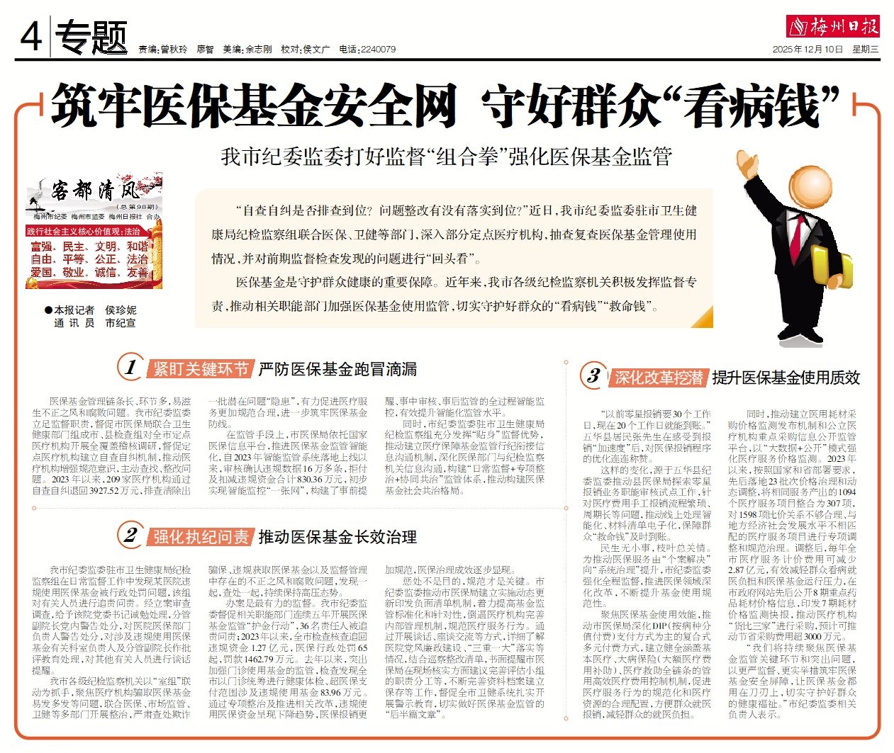 医保基金是守护群众健康的重要保障。近年来,我市各级纪检监察机关积极发挥监督专责,推动相关职能部门加强医保基金使用监管,切实守护好群众的“看病钱”“救命钱”。