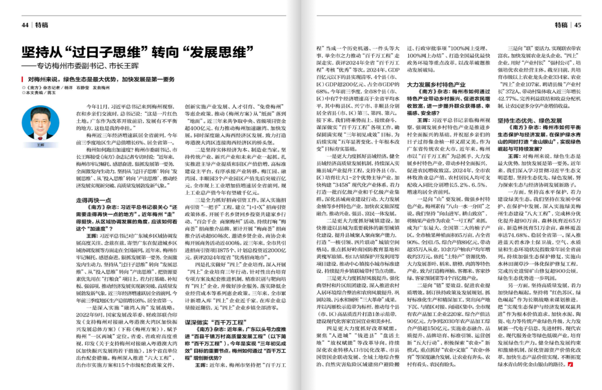 梅州如何跑出加速度?梅州市委副书记、市长王晖接受《南方》杂志记者专访时说:“近年来,梅州市牢记嘱托、感恩奋进,狠抓发展第一要务,全面激发内生动力,坚持从‘过日子思维’转向‘发展思维’、从‘投入思维’转向‘产出思维’,推动经济发展实现新突破、高质量发展勃发新气象。”