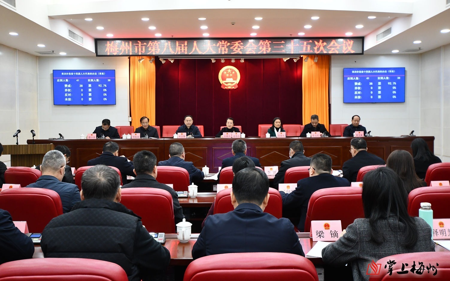 会议表决通过《梅州市八届人大常委会第三十五次会议补选第十四届广东省人民代表大会代表的办法》、补选监票人和计票工作人员名单。会议以无记名投票方式,补选蓝伟东为省十四届人大代表,根据法律法规,其代表资格需报省人大常委会确认。