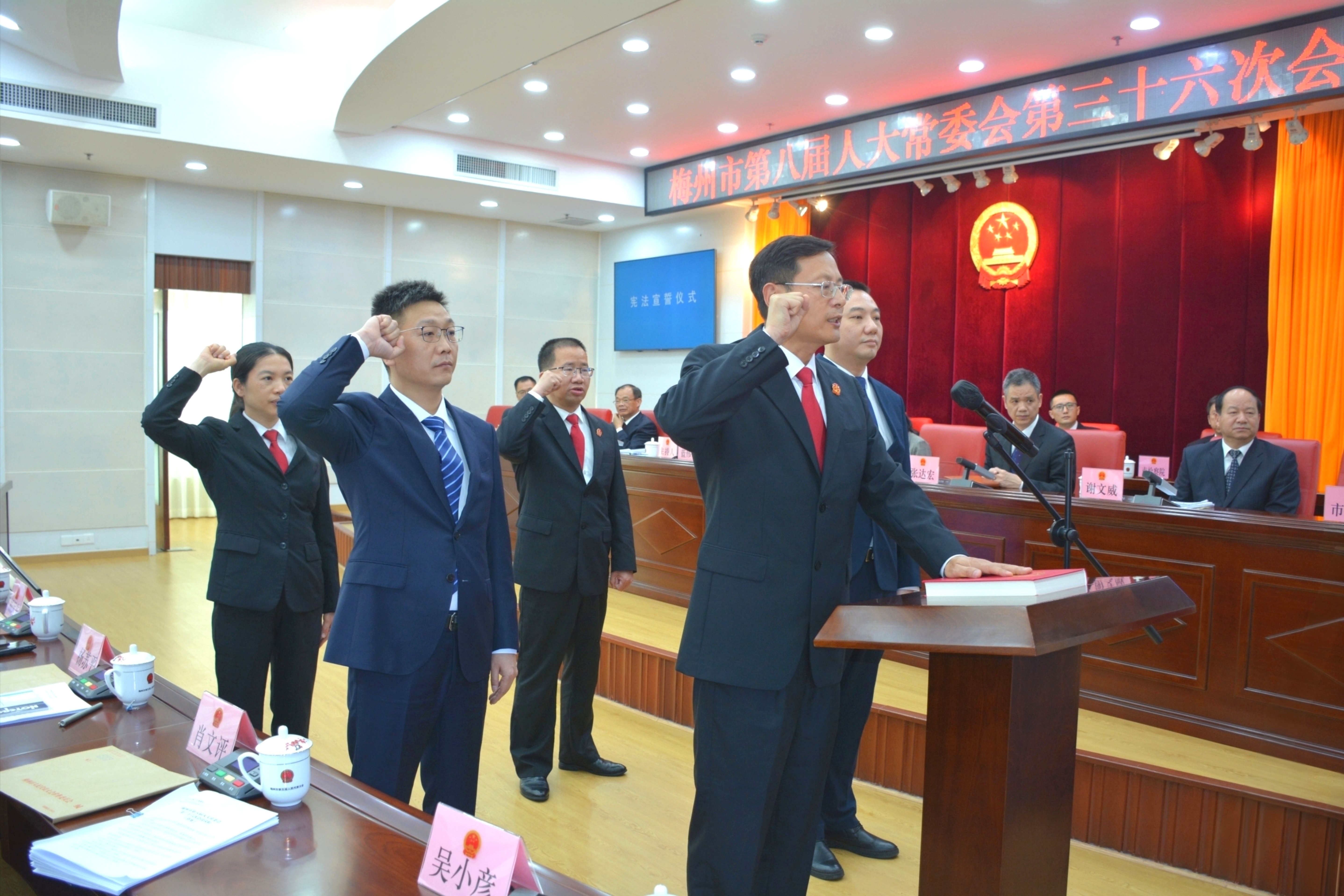 现场为新任命人员颁发任命书,举行宪法宣誓仪式,在市人大常委会组成人员的监誓下,新任命人员向宪法庄严宣誓。