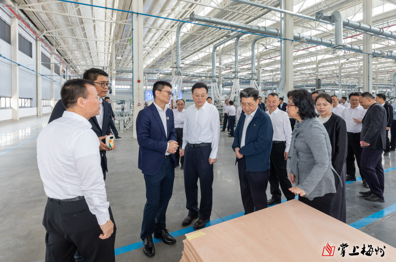 马正勇、王晖、杨朝晖和市委常委一班人等在广东承达智能环保建材科技有限公司调研企业生产经营情况。