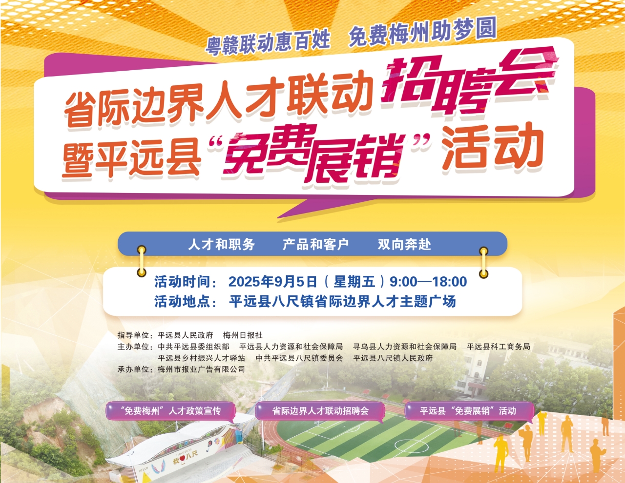 在粤赣交界处,一场跨越省界的人才与产业交流盛会即将拉开帷幕。为深入贯彻落实省市县关于乡村振兴和人才工作的决策部署,充分宣传“百万英才汇南粤”行动计划及“免费梅州”人才政策红利,省际边界人才联动招聘会暨平远县“免费展销”活动将于2025年9月5日在平远县八尺镇举办。